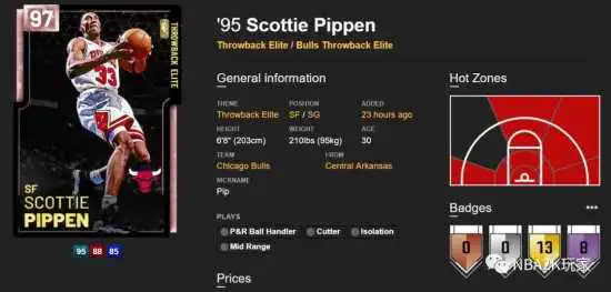 这张粉钻皮蓬的属性总值为4053,六大项中有三项高光(外线得分、运动能力、防守能力)和三项绿区(内线得分、组织能力、篮板能力)。