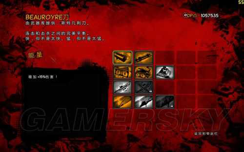 再看看钢叉,我只升级了三个点:伤害、流血和击杀奖励,其实如果完全不升级的话也对进程影响不大,这武器我觉得就是一个鸡肋般的存在,当然你偏爱这武器的话,最好多多花一些点放在流血上,其他功能不升级也罢。