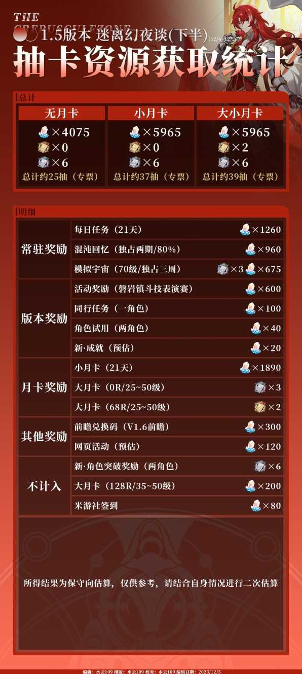 《崩坏星穹铁道》中1.5版本已经过半,那么即将到来了后半部分有多少抽卡资源能够获得呢,下面请看“水云109”带来的《崩坏星穹铁道》1.5版下半星琼数量统计,希望能够帮助大家。