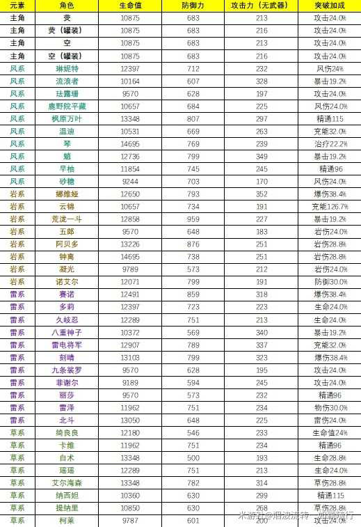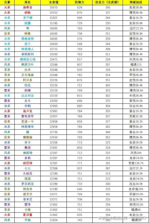 本次整理数据截止V4.3版本,新增水之国角色数据,大家可以根据角色的基础属性以及突破加成属性,进行武器和圣遗物的搭配规划。