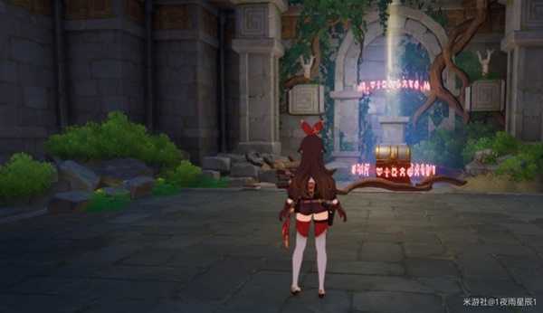 在岩柱旁找到梵米尔完成《渌华景画》后,得到两个石头爬上两个人形雕塑头部提交石头,进入遗迹后获得一个华丽宝箱。