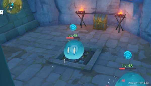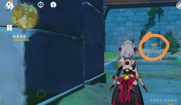 宝箱在碉堡的第二层爬上去即可。通过仓库可以进入,有史莱姆守护,附近还有一个岩神瞳。(注意:不是山上的那个圆形建筑,是在雕塑旁边的山洞建筑内。)