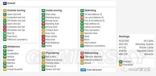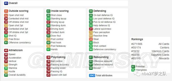 加·赫德是目前唯一一张87能力的蓝卡,估计又是2K习惯性的BUG。加·赫德是一名传统的大前锋,他几乎没有任何的三分能力(48),得分基本都集中在三秒区之内,而且扣篮非常凶猛(85站扣+80突扣),身体素质也算不错(80速度+85力量),是一名运动能力出色的PF。