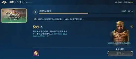 1、每日0点刷新的情报商人和税收事件,属于每日最稳定的一项银币收入。英雄的能力与自身城建都会对该类型事件的奖励有一定比例的增幅。