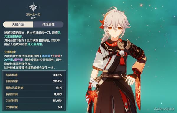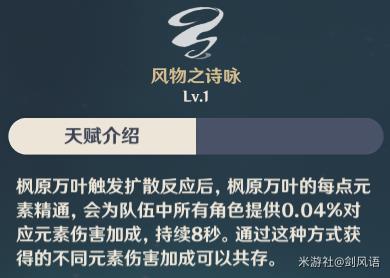 3.【风物之诗咏】增伤核心天赋,触发扩散反应时,队伍获得元素伤害加成【水/火/冰/雷元素】,可以同时触发多种元素伤加成。1000点精通转化40%元素伤害加成。由此看出,万叶主要是提升元素精通属性。这个增伤再加上【翠绿】圣遗物的40%减抗,至少可以给主C提升60%伤害以上。