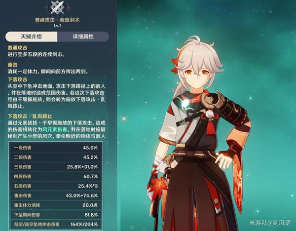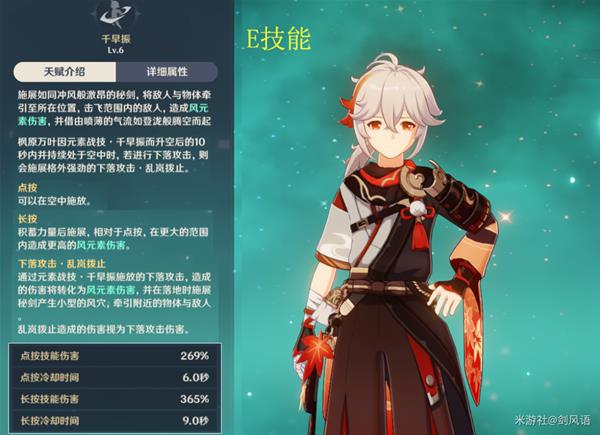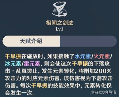4.如下图,突破天赋,E技能触发水/火/冰/雷元素,下落攻击时,除了造成风元素伤害,还附带200%攻击力的对应元素伤害,这个不仅是敌人的元素,自身上的元素也可以转化,例如芭芭拉水环,七七的冰环,行秋的E。