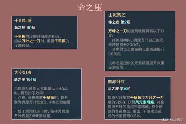 6命,是万叶的质变命座,E技能或大招后,5秒风元素附魔,并增加普攻、重击、下落攻击伤害,这是万叶培养成主C的核心,万叶的技能冷却时间比较短,基本上全程风元素附魔。