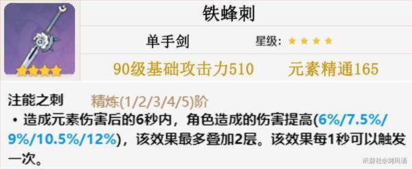 万叶毕业武器,副属性增加元素精通,被动提升自身造成的伤害,同时还提供队伍所有角色普通攻击伤害和攻击力,非常契合。由于6命,以精通提升伤害,因此主C也一样适合带这把武器。