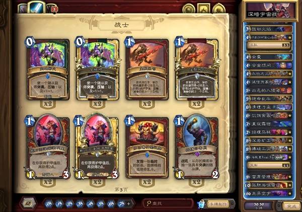 主玩战士,回归以后觉得宇宙战真是战士的完美形态,有控又肉撑过前期就有无限多后期终结比赛的手段。新版本王子退环境后被一开始被法师虐的死去活来,这些天版本稳定,在之前的基础上针对环节做了些调整。主打前期控场,后期看形式终结比赛,分段不高,但实际测下来胜率确实不错。分享给喜欢挨揍的战士玩家们。