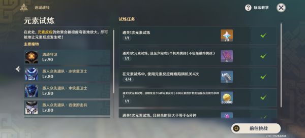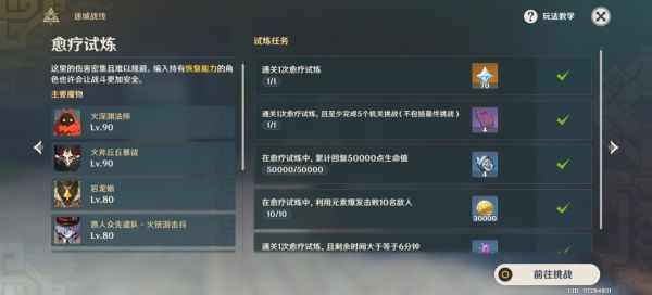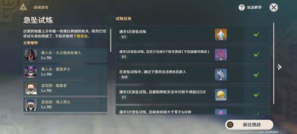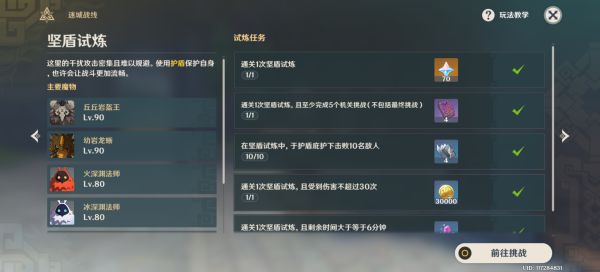 完成试炼的小任务,可以获得对应的奖励,先讲一下六个试炼关卡的相同小任务,一共有三种小任务是相同的分别为:通关对应试炼、过程中完成五种机关挑战、通关时间剩余时间大于等于6分钟,这边有一点要注意五种机关挑战里面不包含最终挑战,所以至少需要完成两种buff挑战才可以