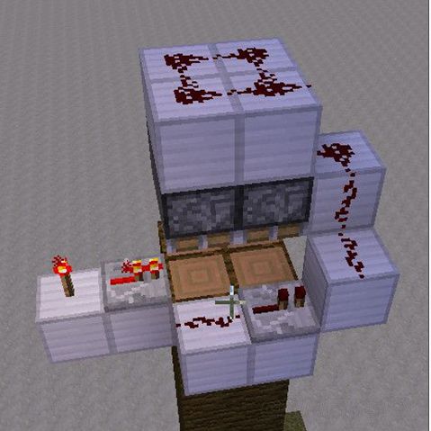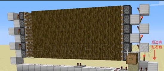 按钮会激活下方的红石粉,红石粉后面是活塞+沙子构成的脉冲器,发出脉冲分别向两边走(这里两边的中继器必须3级以上)。