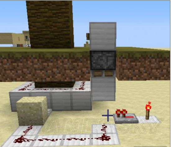 5. 为了方便操作,我把按钮移到了地面上,为了把电路完全隐藏,用活塞来做开关。另外可以看到脉冲发生器也被我下移了一格,为了让沙子不露出地面……