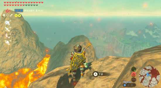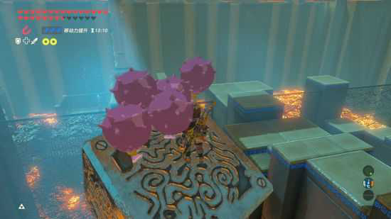 飞下来的图中会发现前面的岩浆里有一个蓝色光圈。然后你后面的陆地有两个大铁箱子,把铁箱子放到光圈里,站到上面神庙就出来了。