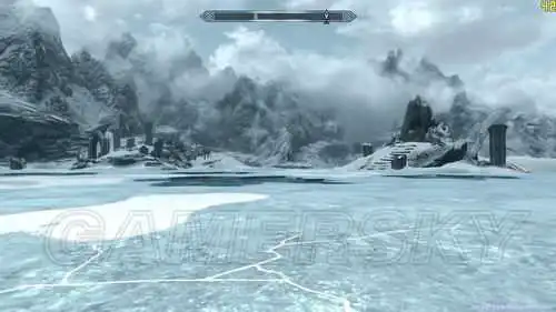4.继续顺着刚才的河流走,过河到对岸,然后顺着小路(图1.5)上山到冻结的冰湖,冰湖上有两条龙,冰湖中间有个龙吼,穿过冰湖后,看到有一扇完整的门柱(图1.6),前面不远处就到了(图1.7)