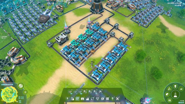 还有一种就是直接使用物流站量化的方式。但是由于前期物资匮乏,且不清楚日后的产量,所以需要预留出空间。这里可以使用总分总的方式,既方便日后拓展,也方便节省空间。前期没有物流站,输入总线上使用储物箱人肉搬运或者离原料产地近的话就把原料的总输出拉过来,然后使用四向分流器进行分流,在分线上使用设备进行生产(设备沿纬线摆放以减少维度变化带来的对不齐的问题),同时在分线方向和总线方向都留出一定空间,方便日后拓展。之后把该最终成品分线汇总成该产品的输出总线,在其上设置四向分流器,一条输出接入下一产品的输入总线或者直接接入日后要替换成物流站的储物箱。同时,另一条输出接一个储物箱,且设定该输出优先,保证每一种成品在每次手搓时都有库存(经常用的传送带分拣器等可以用小黑盒模式做成物品超市,输入为原料储物箱)。