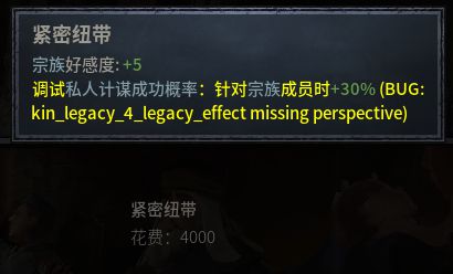 减少流产概率,游戏里一般也不会只生一个,没太大意义,而且下面的【紧密纽带】位置靠后,加5宗族好感和30针对宗族的私人计谋成功率作用不大。后期间谍总管和自身密谋高的情况,不缺这成功率,这俩一起说了,都没用。有点数盈余可以点,说不定能遇到用得上的情况。