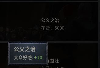 维稳用,短暂统治-20%对换代来说有用,不过换代有更好的压制封臣手段。大众好感+10是很好的,【大众好感】不等于【公众好感】,前者既加封臣、领主、外国君臣的好感,又加直属的公众好感,后者只加直属的公众好感。但是这俩太贵,不走基因飞升的话可以点。走基因飞升的话基本没机会点了,一是点数不够,二是后期这俩其实作用被稀释了。