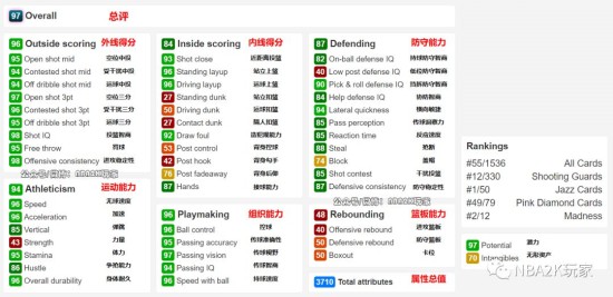 这张手枪的属性总值为3710,进攻端主要依赖投射,95左右的中投三项和97左右的三分三项还是非常优秀的;但内线进攻能力较差,仅有常规的近距离和上篮可用,完全没有背身和扣篮能力。