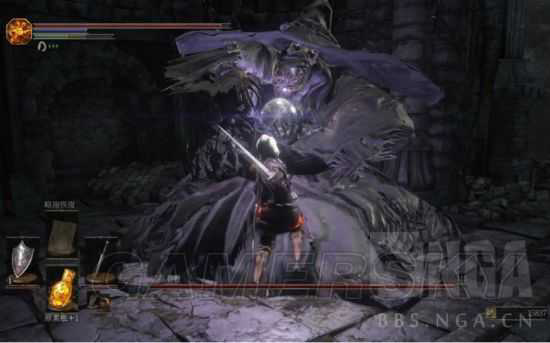 3.一阶段的古达主要是挥动手里的战戟挥砍和斩击,配合抓人投机与腾空跳劈进行攻击,此时只需注意左右侧向翻滚躲避攻击,寻找机会反击即可。不建议一直持盾抵挡攻击。