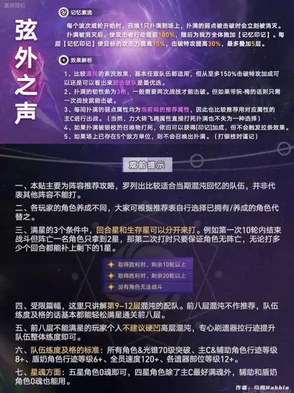 《崩坏星穹铁道》弦外之声混沌大幅加强了击破伤害,很多玩家想要知道本期混沌如何获取全部奖励,下面请看“乌鸦Rabble”带来的《崩坏星穹铁道》弦外之声满星阵容推荐,希望能够帮助大家。