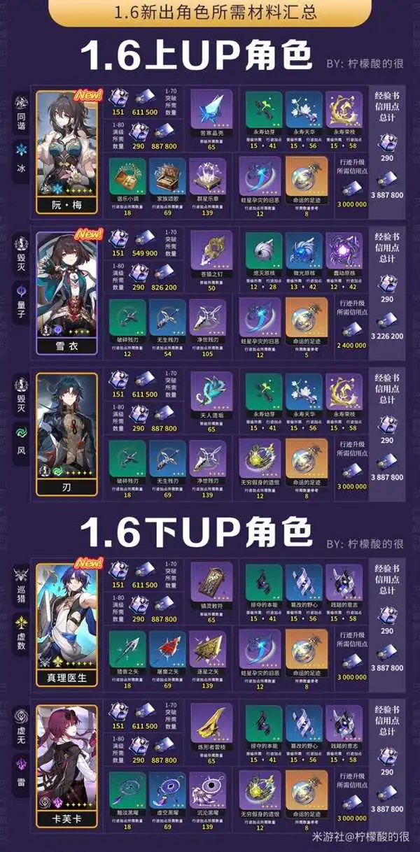 正文 《崩坏星穹铁道》1.6版本UP角色材料一览 真理医生突破素材有哪些 游戏引路人 /2024-12-15 10:16:12 /59 浏览量 1215 《崩坏星穹铁道》中1.6版本将会有多个角色UP,想要知道他们材料需求的玩家请看下面“柠檬酸的很”带来的《崩坏星穹铁道》1.6版本UP角色材料一览,希望能够帮助大家。 -- 展开阅读全文 --