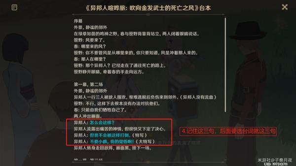 4.然后会给我们看台本,记住蓝色字条那部分,后面我们演戏的时候,需要选择这些台词;