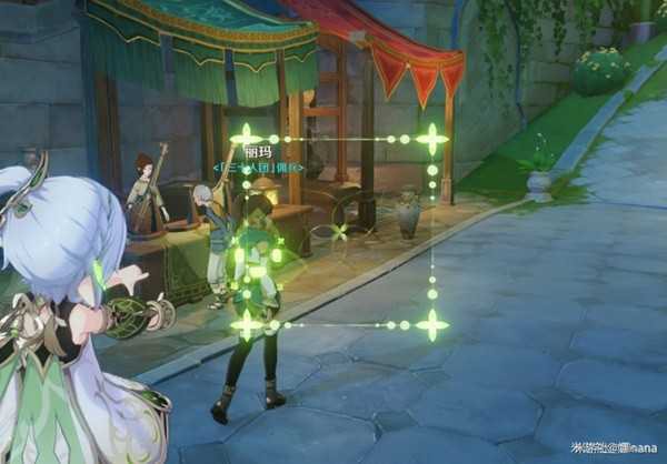 被纳西妲元素战技中间的小框框瞄准时会出现一个类似四叶草图案(蕴种印)在敌人的身上。