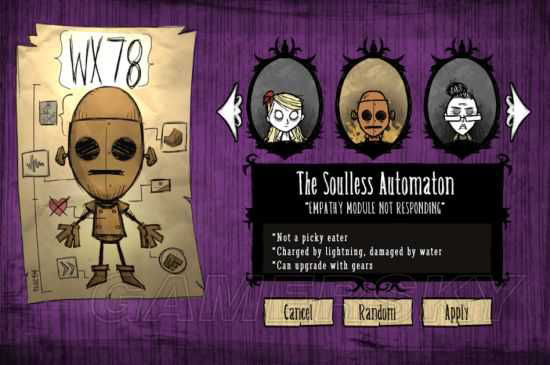 备注:可能有人觉得wx78对新手只有三颗心有点少,但其实他初始三维全100并且要有齿轮升级大大的提升了生存难度,新萌对付齿轮怪可能比较麻烦并且他们的齿轮大多要用于冰箱什么的,但是一旦技术起来了这个人物可谓是好用人物前三名了。