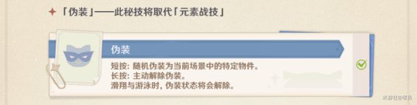 元素战技:【伪装】,在每个场景中,会有三个可以伪装的物品,可以短按进行切换,长按或者滑翔游泳时解除。