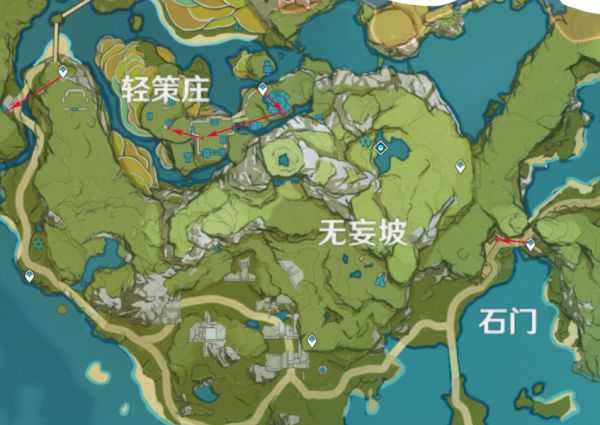 石门东一条线路两个调查点(路线较复杂,收益较低,但因目前圣遗物经验短缺,现补上):