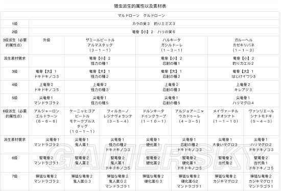 2下面一图则是本帖的精髓所在,各个等级需要的属性点以及素材,可以帮助操虫棍玩家方便的喂出自己想要的虫子并且可以尽可能的将属性点分布在自己需要的地方而打造自己最棒的猎虫。