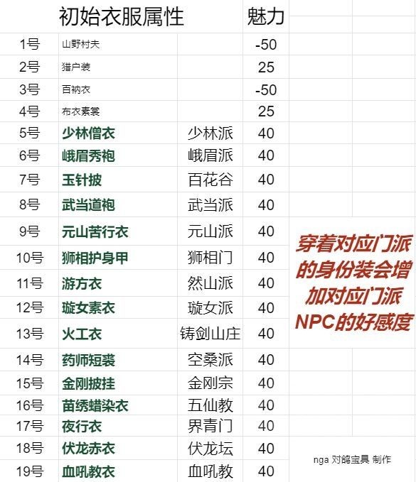 《太吾绘卷》中有许多初始服装,这些服装会影响角色的魅力值,而且穿着不同门派的服装也会影响相应门派NPC的好感度,下面请看由“对鸽宝具”带来的《太吾绘卷》初始衣服属性一览,希望对各位玩家有帮助。