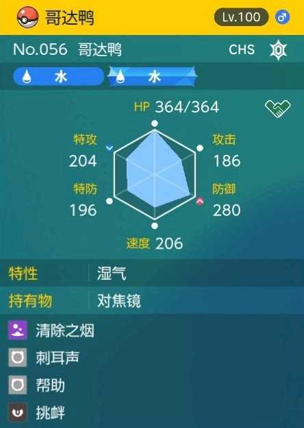 2)哥达鸭:大胆性格,努力值252hp 252防御 4特防,携带道具对焦镜(对焦镜的效果是后手行动时命中率提升1.2倍,因为甲贺忍蛙总是比我们先动,刺耳声的命中率是85*1.2后就不会miss了,没有的可以去酿光市信使鸟商店购买),核心技能携带“清除之烟”、“刺耳声”、“帮助”