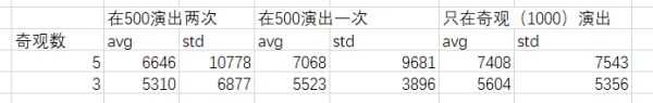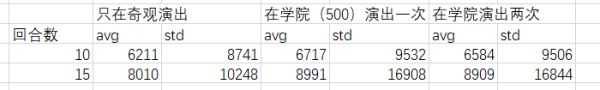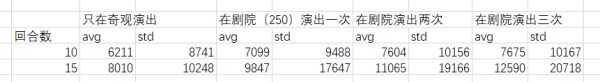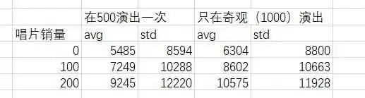 可以看出,只要有足够的奇观,那么在箱较低的场所演出就是亏的,符合直观。avg是产箱平均值,std是标准差(这分布也太神棍了,只取正值,标准差比平均值还大)0.0