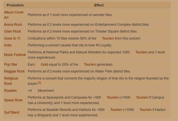 除开港口演出和加移动力两个聊胜于无的升级(加移动力说聊胜于无其实有点委屈),其余五个都很强力。剧院演出和娱乐演出升级可以极大增加演出大成功的概率,快速提高等级和专辑销量;而goes to 11溅射到两家就能直接让产箱翻倍(对其他文明的产出箱不在演出结果面板中显示)。学院演出就直接让大学变成奇观,还能增加乐队等级。奇观演出就是王道征途了。