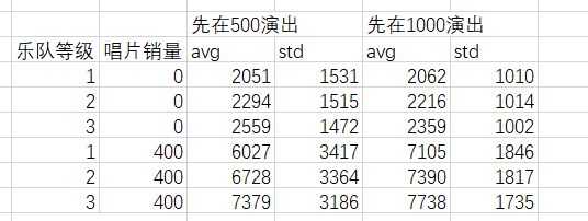 6,乐队无特殊升级,在500和1000基础的场地上各演出一次(两个场地没有演出等级加成的区别):策略A,先到500场地演出再到1000演出;策略B,先到1000演出再到500演出。
