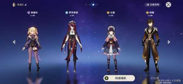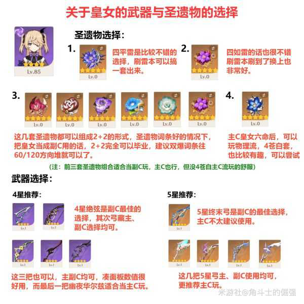 关于最后一套阵容,是皇女的主c阵容,推荐有6命的皇女玩家,皇女带有双爆词条的武器,或者攻击力/物理伤害加成的武器,带4苍白或苍白、染血骑士2+2都可以,这套阵容可以算作最大程度提高皇女的输出,对于走位自信,也可以把钟离换成班尼特,上限更高。