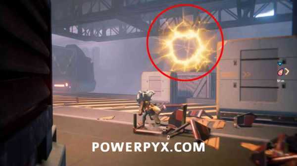 在市场区域找到祖康女士(武器商人)后向右走,沿着磁浮坡道一直走到工厂入口,此时地图上会出现一个目标标记。