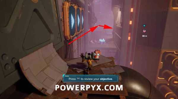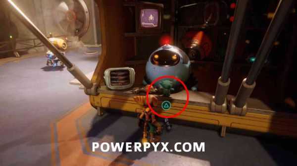 获得万能手套(随剧情流程获得)后,返回科森五星北侧的初始地点。拥有了万能手套之后就可以在这种带有蓝色箭头的磁力墙壁上移动了,穿过这些墙壁即可找到黄金螺丝。