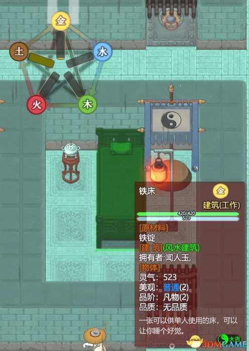 这就回到了上一节的问题所在,如下图所示,尽管坐落了一张铁床,但床所在的单元格仍是土属性的。(其中的金属性来源于岩石地表,其他土地也多含有水木属性这是没法消除的)