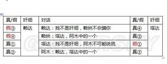 作者是以塔达为出发点的(赖达也可以),方法是先假设塔达说话的真假,然后判断出奸细是谁,然后确认其他人说话的真假【有顺序】,判断标准【只有奸细说了假话,奸细只有一个】