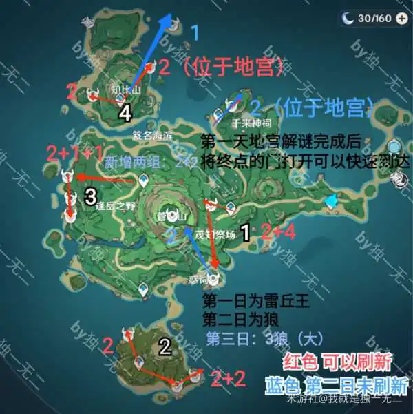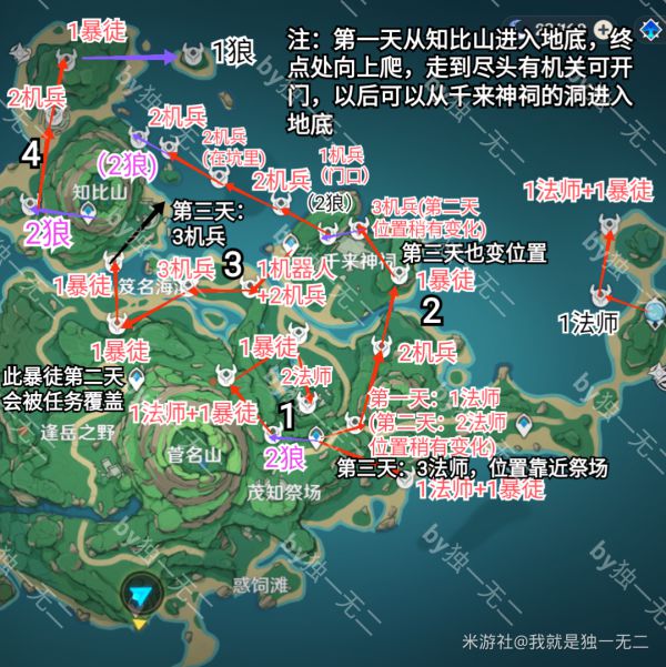 红箭头旧精英,紫箭头新精英,蓝箭头600摩拉精英。黑色字体表示不刷新,黑箭头白字为之后新增的点位。