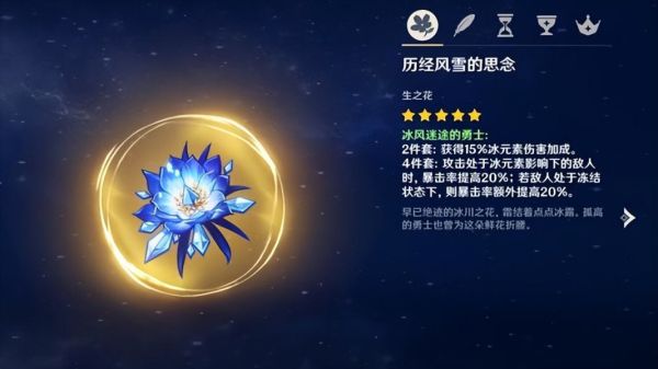 由于元素精通,对冻结反应,没有多少伤害加成。所以圣遗物推荐【冰风迷途的勇士】4件套。2件套有冰元素加成,4件套在冻结效果下,能够额外获得40%的暴击率加成。对于,不打反应的甘雨来说,稳定的暴击,能够保证她能够打出相对稳定的伤害。