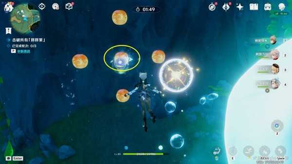 开启挑战,一共有3个波次的胖胖果需要击破,目标选择中间的胖胖果,【长按E,再引爆】技能攻击,3个波次都这样。