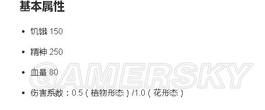 基本属性奠定了这个角色是一个非战斗性角色。80血的上限让小编打海象也得找一波帮手(一般角色不耗血?硬刚的话得了解80血和0.5倍伤害带来的惨痛经历)花形态的正常攻击加成时间我基本只是做些拆蜘蛛窝刷刷影怪之类的事。这个角色不适合打架!不适合打架!不适合打架!小编在经历打遍天下无敌手的“寂寞”后发现这个角色给我带来了一些饥荒的新意:从今天开始,不要干,就是怂!能不动手就不动手,需要动手优先动脑。