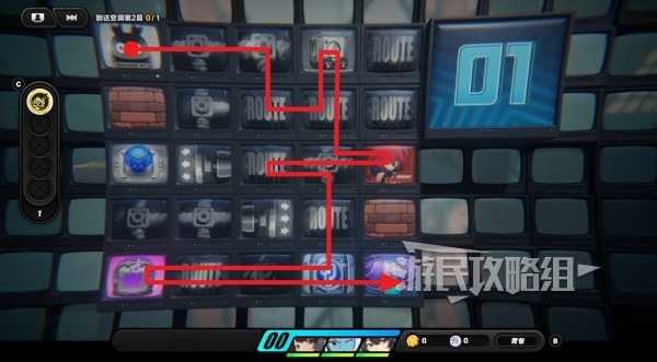 进入第一层后,往右往下走到箱子下方,往上走一格与箱子交换位置,然后把箱子推到珂蕾妲所在的一行,来到珂蕾妲所在位置,不要与珂蕾妲互动,直接把箱子往左推到头,利用弹簧把箱子弹到最左边的机关上,打开最下方的机关门,通过下方机关门拾取左下角的紫色物资,然后进入右下角传送门。