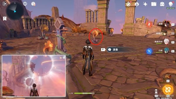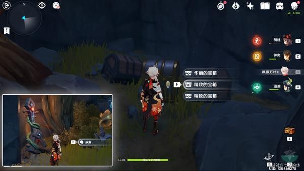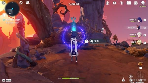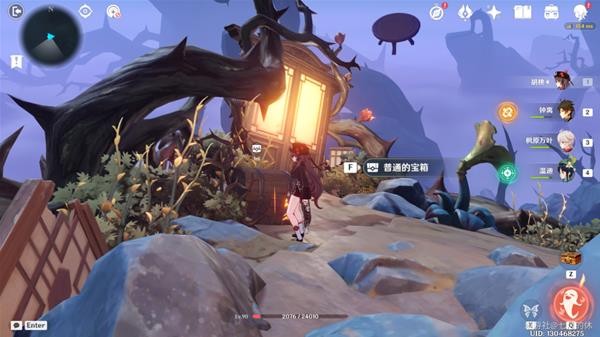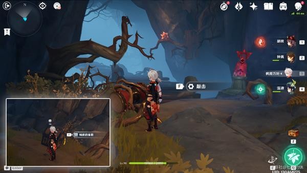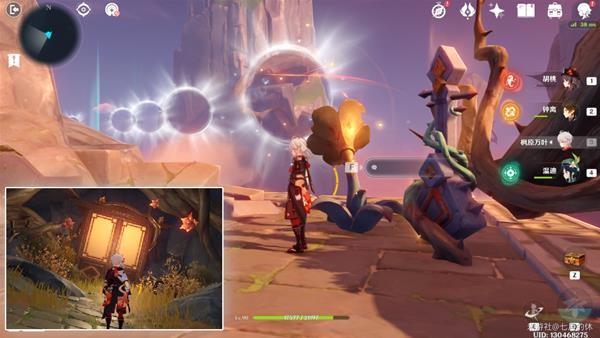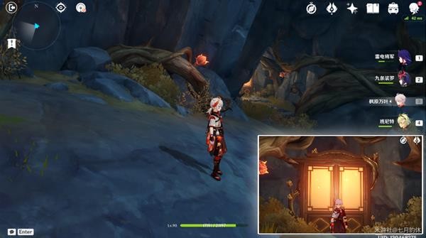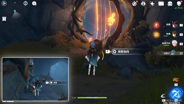 16.洞口处有个鼓,击鼓出现路,并且被树藤锁住的宝箱也解锁了!走到尽头(冰花洞口),这里用钟离/岩主,搭给垫脚的,然后用温迪/万叶腾空飞过去,温迪+万叶2段跳也可以。没有就只能原路返回了!