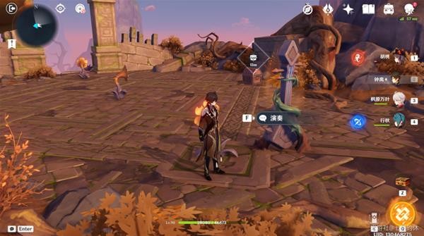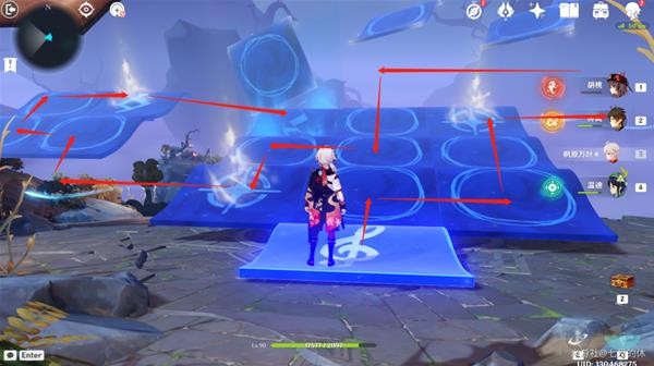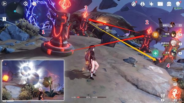 21.再演奏树琴,飞到4个火元素方碑这,靠近鹤,会提示方碑的点亮顺序,如图所示,用火元素角色依次点亮即可!