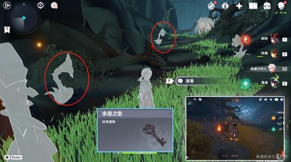 23.进门就可以看到宝箱,往里走,把红圈标记的喇叭机关各调1次,演奏树琴即开启宝箱,获得任务道具「余音之匙」