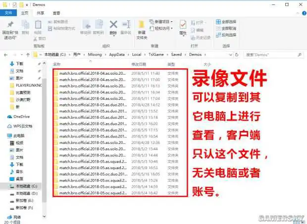 当然了,配置文件占用的空间都是非常小的。占空间比较大的就是录像文件和崩溃报告文件了,录像文件其实还好,一般都只会保存20场的游戏录像,如果吃鸡了单场比赛的文件最大也就三十几兆,20场的文件一般来说也就300M左右的样子,其实也不必太在意。当然,对录像文件不感冒的玩家可以选择删除,游戏内同样也可以进行删除,不过只能一场一场删除有些麻烦罢了。